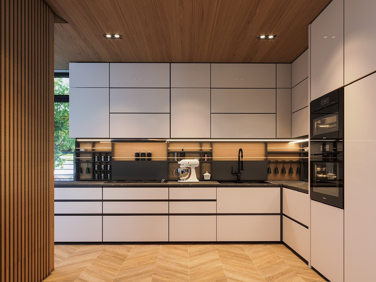 Với các chiếc tủ cao và hẹp, bạn có thể tạo ra ảo giác về chiều cao trong không gian bếp. Điều này giúp kéo tầm nhìn lên trên, tạo ra cảm giác không gian rộng rãi và thoáng đãng hơn, kể cả khi không gian trần nhà không quá cao.