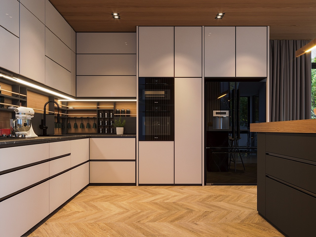 Bên cạnh đó, nhà bếp này thực sự lấp lánh với các chi tiết tủ có độ bóng cao, các bề mặt bằng đá cẩm thạch. Sự kết hợp giữa ánh sáng và bóng tạo ra hiệu ứng lấp lánh rất cuốn hút và sang trọng.