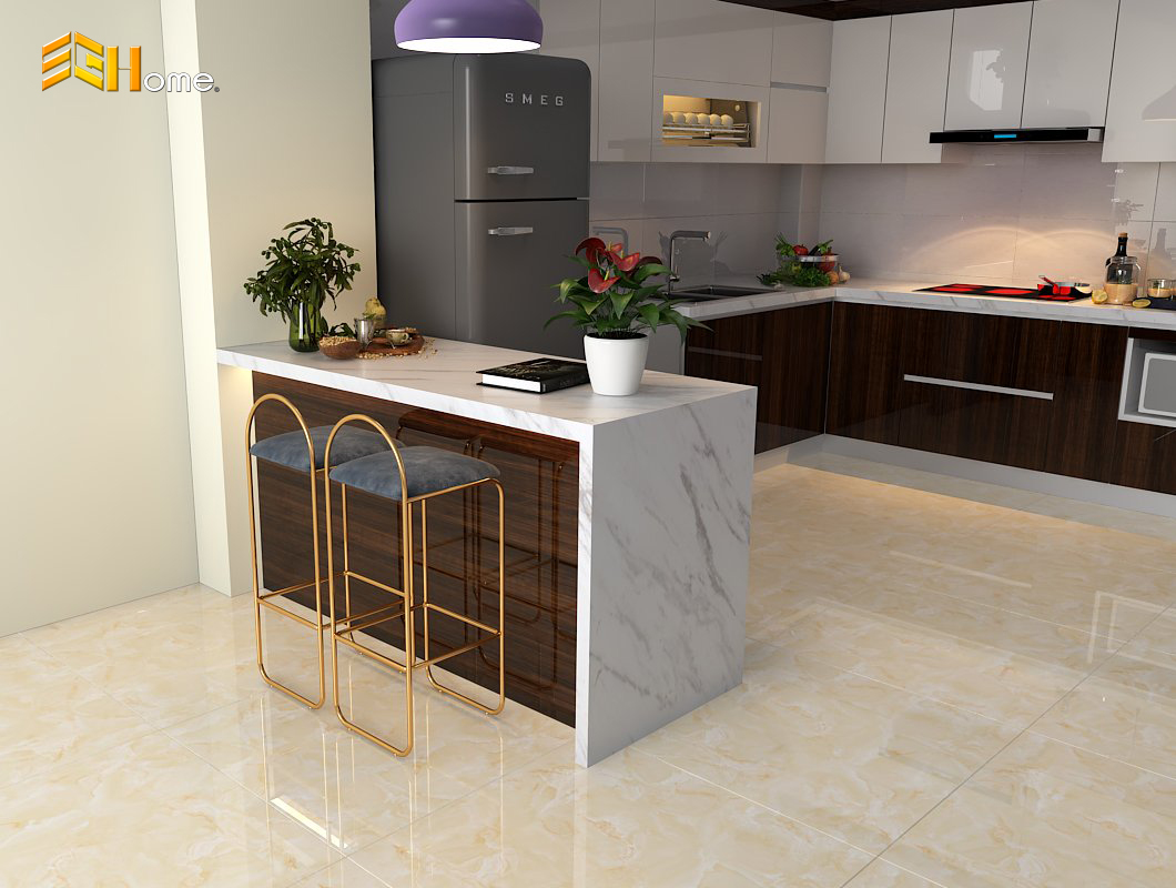 Để tăng tính tiện ích và độ bền, Sài Gòn Homes sử dụng gạch thay thế cho kính trong việc ốp bếp. Điều này không chỉ tạo ra một bề mặt bền bỉ và dễ vệ sinh mà còn mang lại một vẻ đẹp độc đáo và riêng biệt cho không gian bếp.