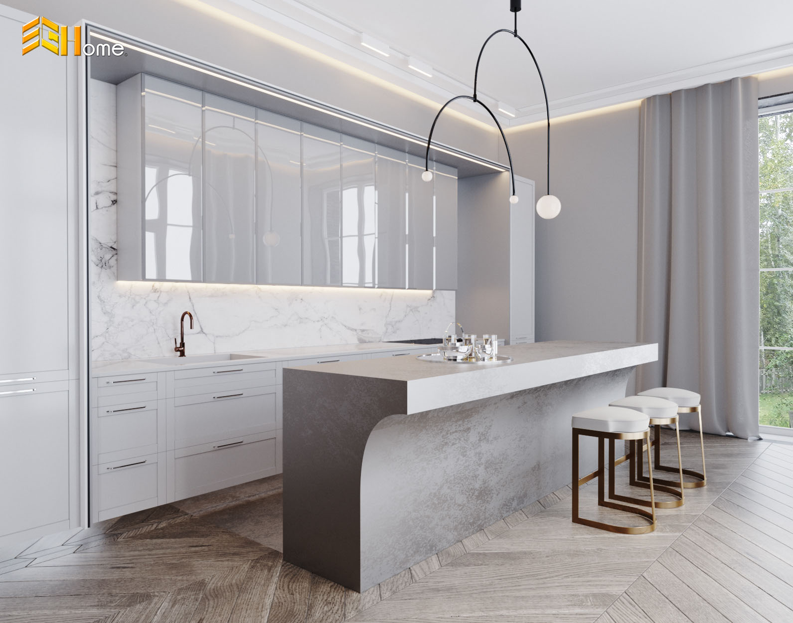Một điểm nhấn đặc biệt trong thiết kế này là bàn đảo, đóng vai trò như trung tâm thu hút sự chú ý của cả căn phòng. Bàn đảo không chỉ là nơi để chế biến thực phẩm mà còn được thiết kế uốn lượn đẹp mắt, tạo nên một sự mềm mại và độc đáo trong không gian bếp. Bàn đảo này được phủ lớp laminate, mang lại độ bền và khả năng chịu lực cao, đồng thời tạo ra bề mặt sáng bóng, dễ vệ sinh.
