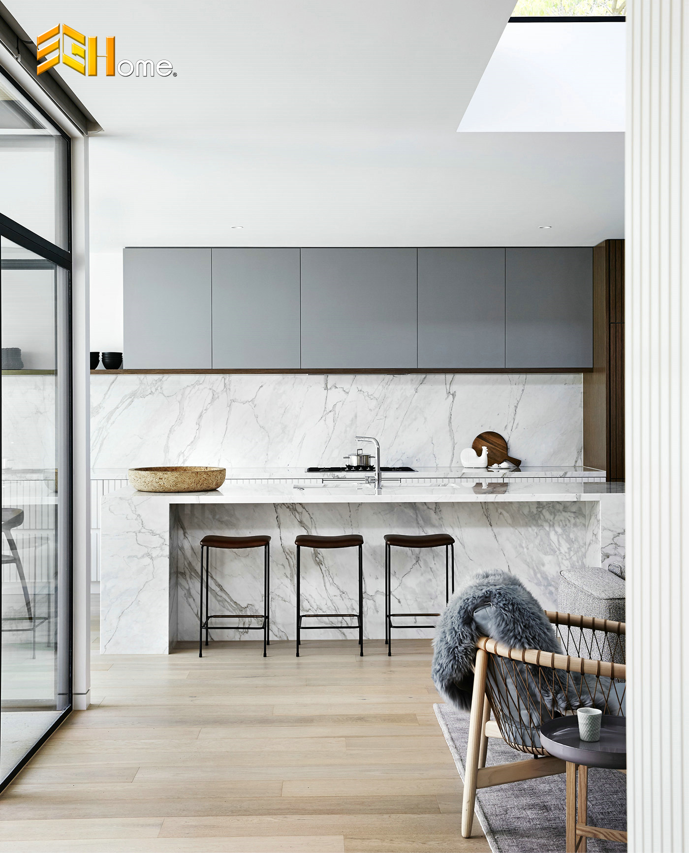Quầy bar và mặt bàn bếp được làm bằng đá trắng vân mây không chỉ mang lại cảm giác dễ chịu mà còn tạo điểm nhấn đặc biệt cho không gian nội thất. Được biết đến với kết cấu vững chắc và tính năng thoải mái khi chặt băm trên bề mặt bếp, đá trắng vân mây không những đáp ứng nhu cầu sử dụng mà còn nâng tầm thẩm mỹ của không gian bếp.