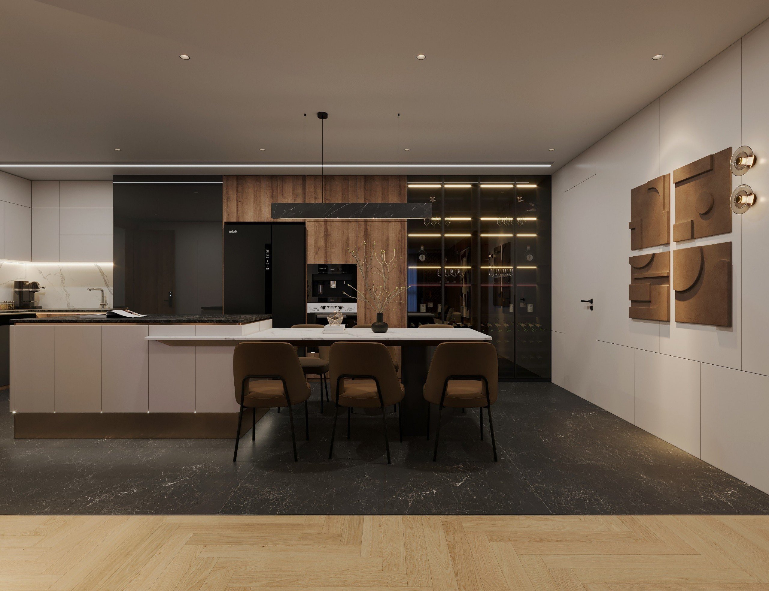 Tủ rượu được thiết kế với cánh kính, không chỉ tạo ra sự mở rộng và thoáng đãng cho không gian mà còn làm nổi bật không gian bếp. Sự kết hợp giữa tiện ích và thẩm mỹ trong thiết kế tủ rượu tạo ra một điểm nhấn độc đáo và thu hút, làm cho không gian bếp trở nên sang trọng và hiện đại hơn.