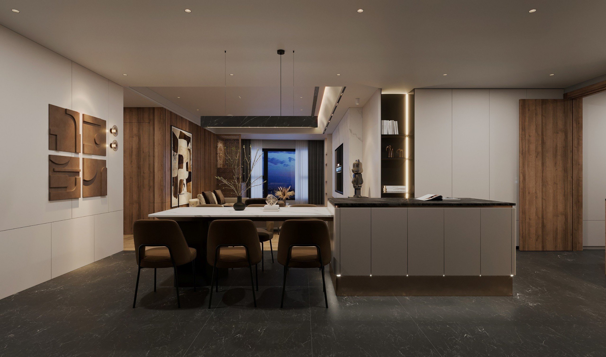Hệ tủ bếp được thiết kế như một hệ thống nối dài, kết hợp các phần khác nhau như tủ bếp, tủ lạnh, tủ kho, tủ cột và tủ rượu, tạo ra một không gian bếp vừa sang trọng vừa tiện ích. Bên cạnh đó, việc kết hợp bàn đảo với bàn ăn là một giải pháp tiết kiệm chi phí và tối ưu hóa diện tích, giúp không gian bếp trở nên linh hoạt và đa năng. Bàn đảo không chỉ là nơi chuẩn bị thức ăn mà còn có thể dùng làm bàn ăn sau đó, tạo ra sự tiện lợi trong việc sử dụng không gian.