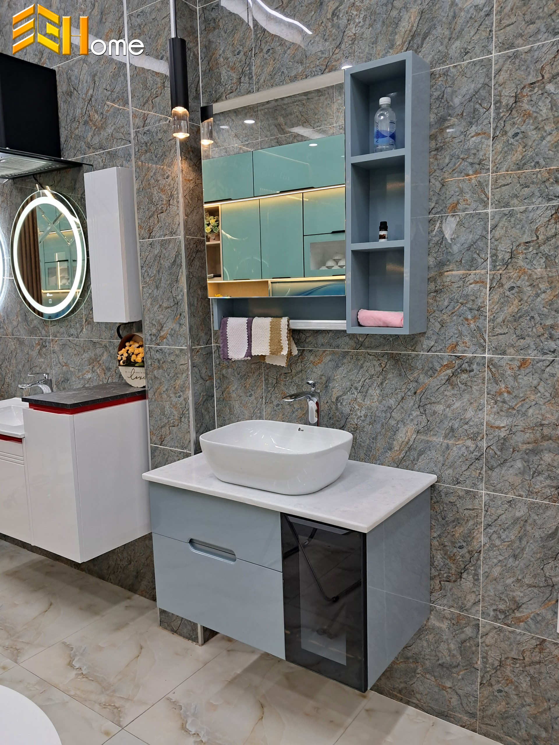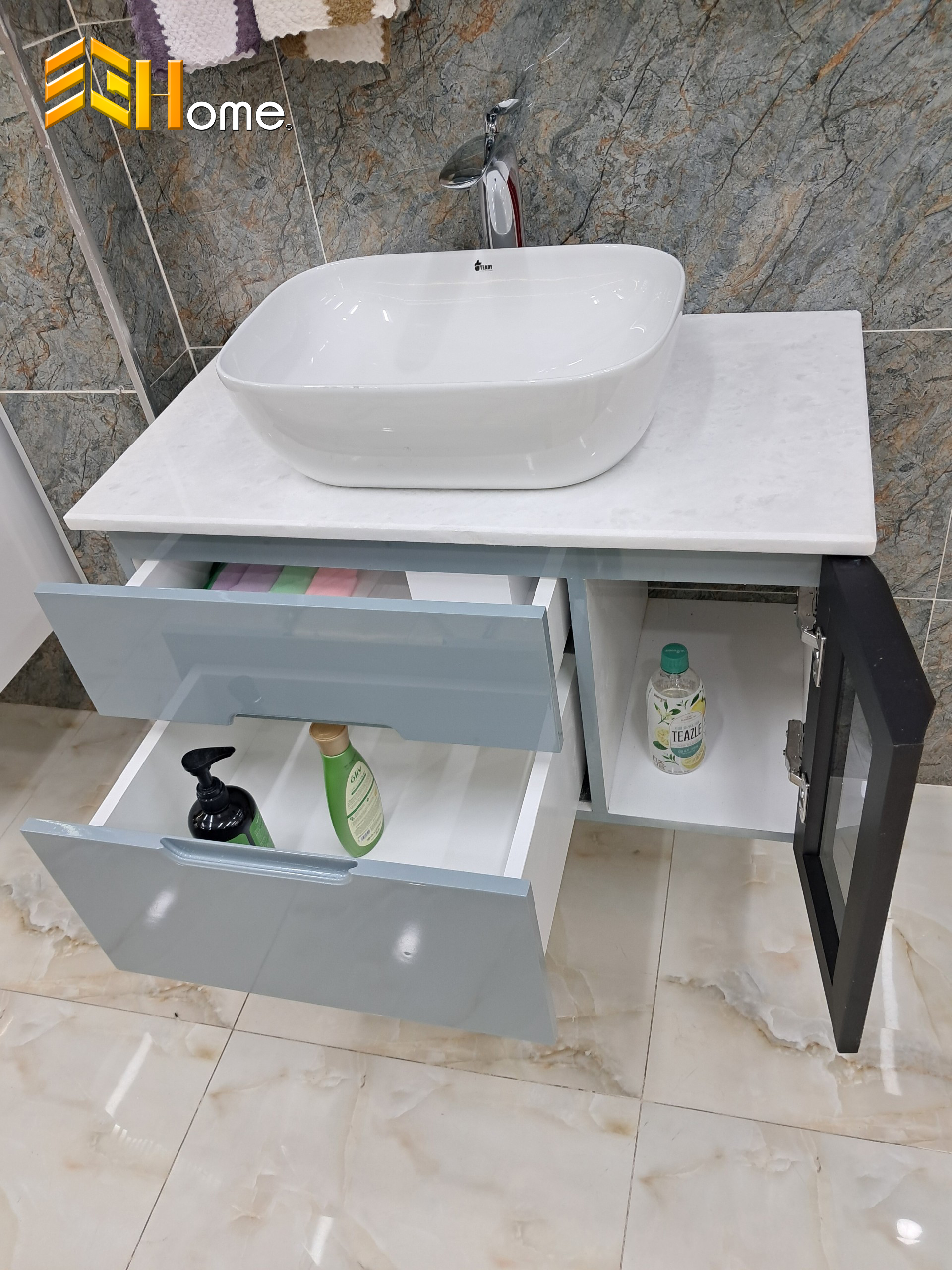 Tủ lavabo đi kèm với gương đa tầng, được thiết kế để tối ưu hóa diện tích và sắp xếp đồ dùng cá nhân một cách khoa học. Màu sắc ghi trung tính không chỉ tạo điểm nhấn mà còn dễ dàng phối hợp với các phong cách trang trí phòng tắm khác nhau. Các khoang lưu trữ được chia thành hai phần: một khoang với cánh tủ mở chứa đồ dùng có kích thước lớn và một khoang với 2 ngăn kéo tiện dụng, giúp người dùng dễ dàng tiếp cận và sử dụng các vật dụng hàng ngày.