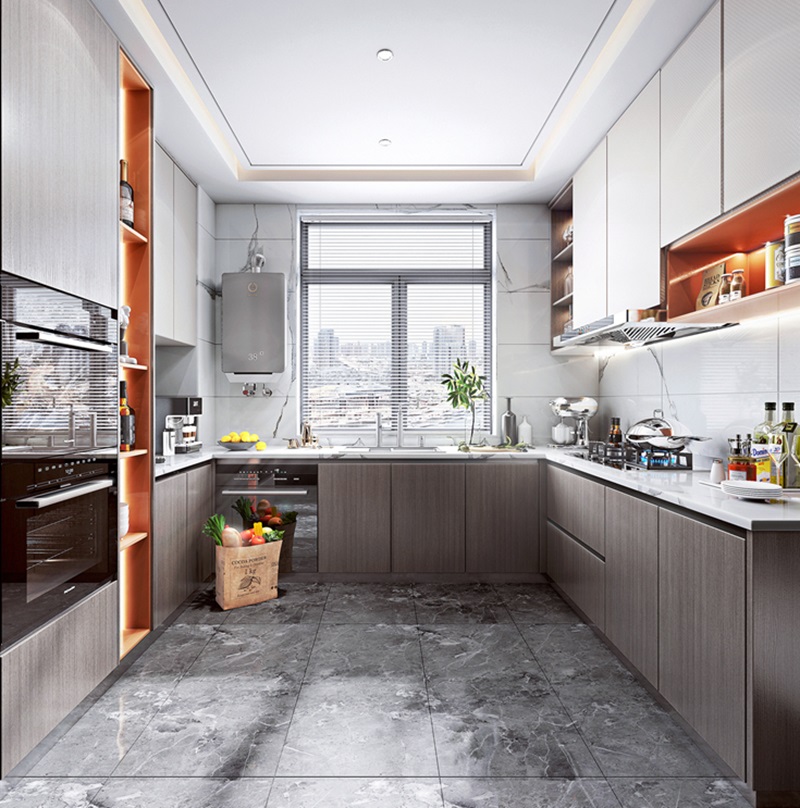 Nếu sở hữu một không gian bếp rộng rãi, tủ bếp chữ U sẽ là sự lựa chọn lý tưởng. Thiết kế này bao quanh ba mặt tường, tạo ra khu vực nấu ăn, bồn rửa và lưu trữ một cách khoa học. Với bố cục này, gia chủ có thể dễ dàng thao tác nấu ăn mà không phải di chuyển quá xa giữa các khu vực chức năng.
