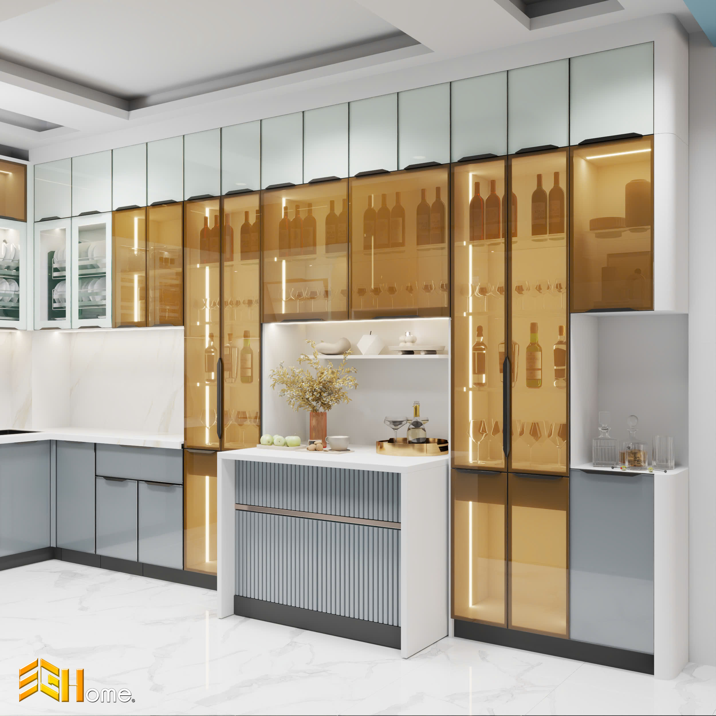 Tủ bếp nhôm kính màu xám là sự kết hợp hoàn hảo giữa vẻ đẹp hiện đại của nhôm và sự sang trọng của kính. Cánh tủ kính giúp không gian bếp trở nên sáng sủa và rộng rãi hơn, đồng thời tạo điểm nhấn ấn tượng cho không gian. Tủ bếp nhôm kính màu xám đặc biệt phù hợp với những người yêu thích phong cách tối giản, tinh tế và hiện đại.