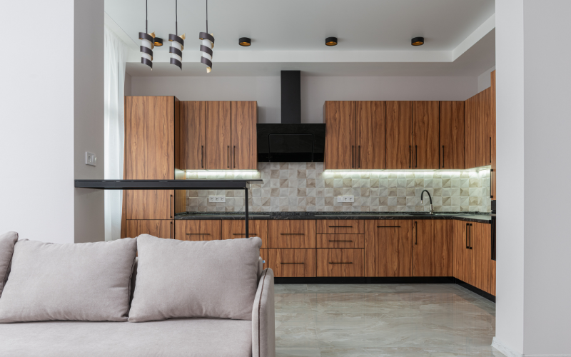 Tủ bếp gỗ công nghiệp được làm từ gỗ công nghiệp và thường được phủ laminate hoặc melamine. Chất liệu này mang lại khả năng chống ẩm và trầy xước tương đối tốt, nhưng độ bền không bằng tủ nhựa Acrylic. Dễ dàng vệ sinh là một ưu điểm của tủ gỗ công nghiệp, nhưng sản phẩm này có thể không giữ được vẻ mới lâu dài như tủ nhựa. Về thiết kế, tủ bếp gỗ công nghiệp có đa dạng mẫu mã và màu sắc, nhưng thường có phần kém sang trọng hơn so với tủ bếp gỗ tự nhiên.