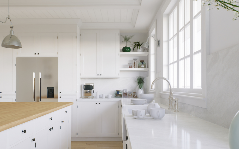 Khi thi công tủ bếp chữ U, gia chủ việc cân nhắc kỹ lưỡng về ánh sáng là yếu tố vô cùng quan trọng để tạo nên một không gian bếp thoáng đãng, tiện nghi và thẩm mỹ. Nếu có điều kiện, bạn nên tận dụng ánh sáng tự nhiên bằng cách tạo không gian cho cửa sổ lớn để đón ánh sáng vào nhiều nhất có thể. Các không gian bếp chữ U thường được thiết kế với cửa sổ rộng nằm phía trên bồn rửa, nhằm mang lại nguồn ánh sáng tự nhiên dồi dào, làm cho không gian bếp trở nên sáng sủa và tươi mới. Ánh sáng tự nhiên không chỉ giúp tiết kiệm năng lượng mà còn mang lại cảm giác dễ chịu và thoải mái cho người sử dụng.