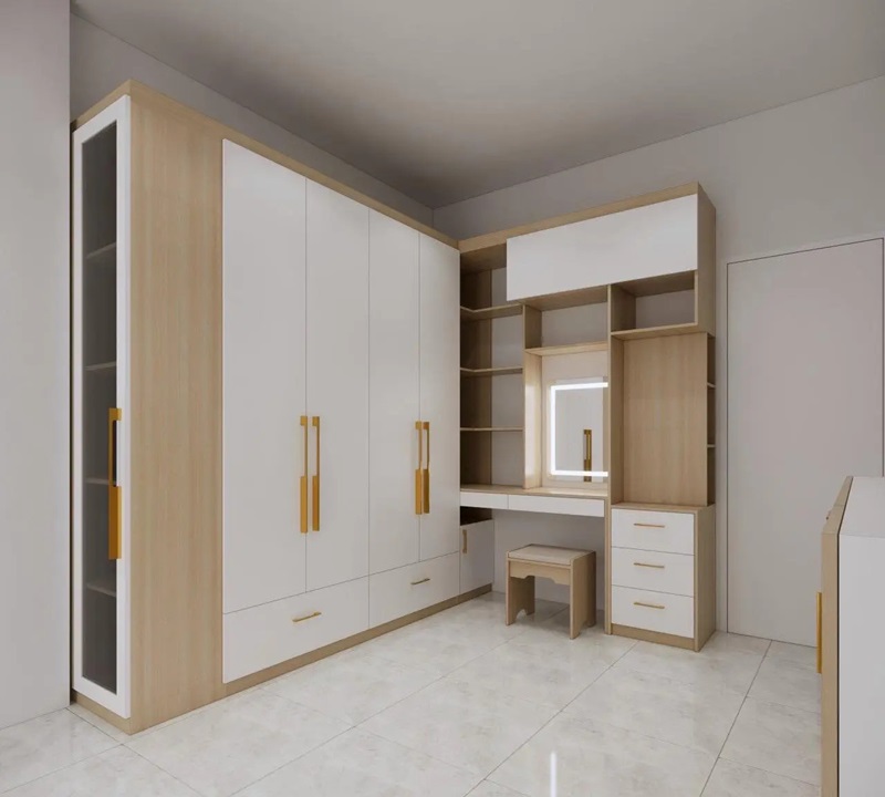 Việc lựa chọn tủ quần áo kết hợp bàn trang điểm là một trong những nét đặc trưng của thiết kế nội thất hiện đại. Khi kết hợp với nhựa PVC và sơn bóng oto cao cấp, không chỉ mang lại tính thẩm mỹ mà còn tạo nên sự sang trọng và tiện ích tối đa cho không gian sống.